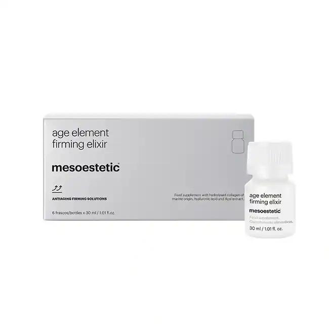 age element® firming elixir (mesoestetic) es un complemento alimenticio con una acción integral, formulado con 10 g de colágeno hidrolizado, ácido hialurónico y un complejo antioxidante. Incluye péptidos de colágeno marino y activos como extracto de açai y extracto de licopeno, orientados a ayudar a frenar el daño oxidativo. Presentación: 6 x 30 ml, sabor mandarina y mora, sin azúcares.